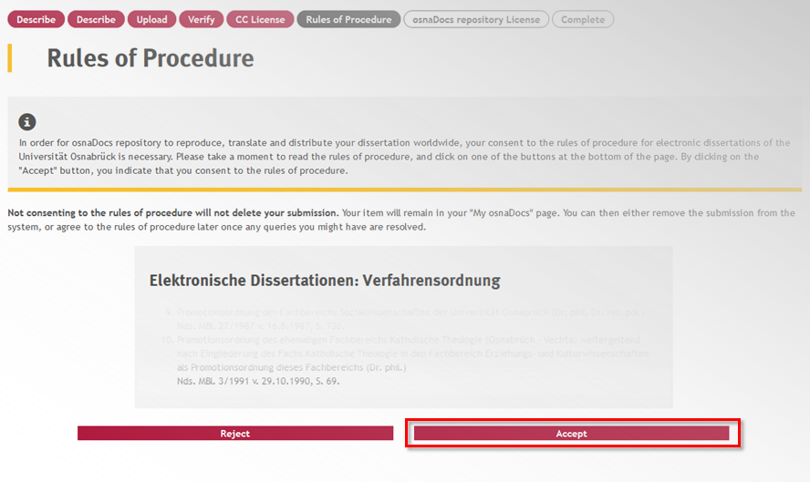 Now the only step left is to accept the conditions for publication in osnaDocs.