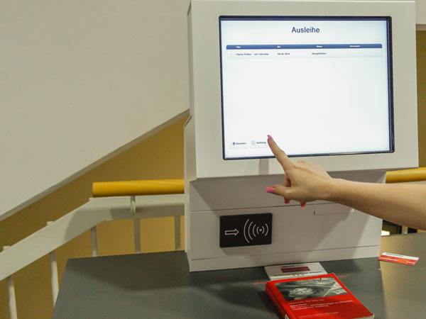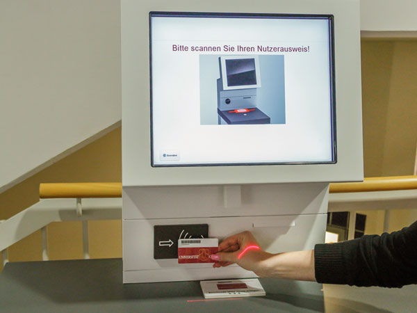 Halten Sie die Campuscard bzw. den Bibliotheksausweis vor das Lesegerät. Ihr Bibliothekskonto wird geöffnet.